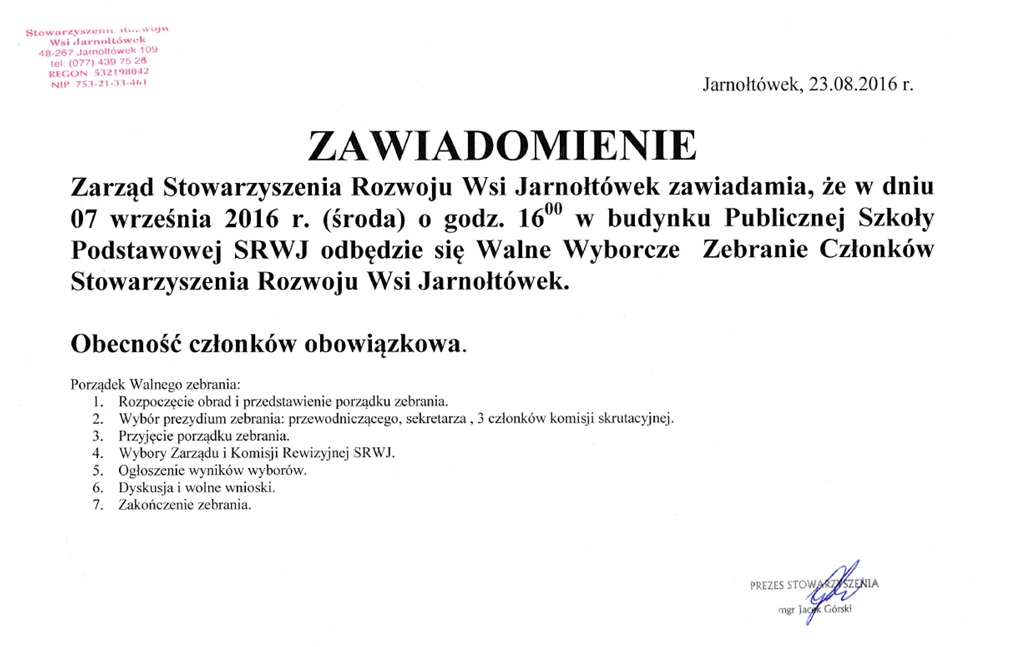 ZAWIADOMIENIE O ZEBRANIU WALNYM STOWARZYSZENIA ROZWOJU WSI JARNOŁTÓWEK