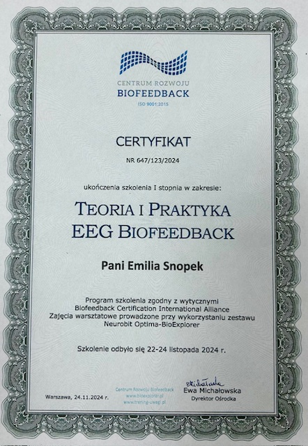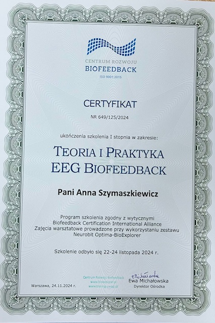 CERTYFIKAT EEG BIOFEEDBACK DLA NASZYCH PEDAGOGÓW